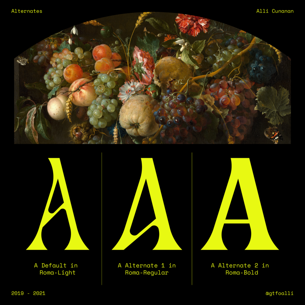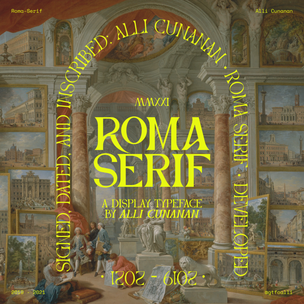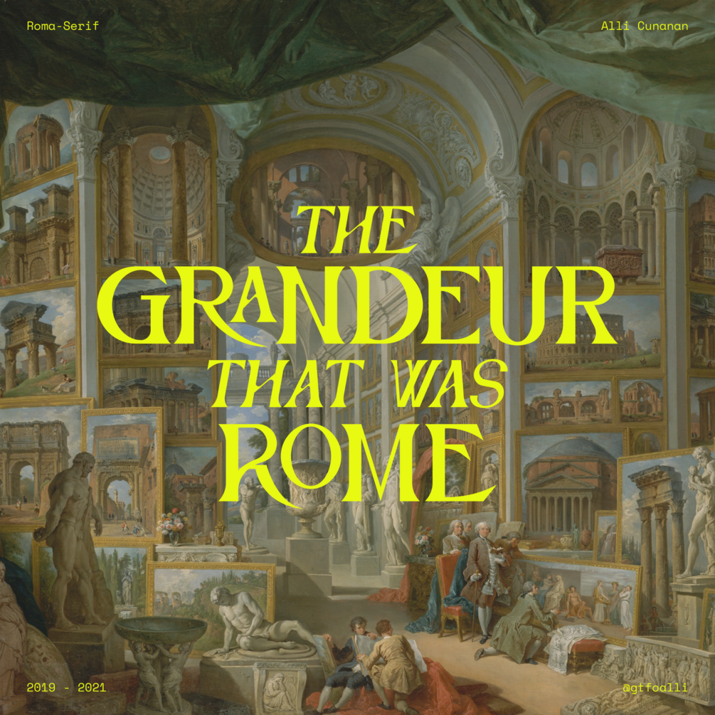 Roma Serif is an uppercase display typeface, first created in 2019 and refined in 2021. Drawing inspiration from the timeless grandeur of the Roman Empire, it blends classic elegance with a modern sense of stability. Every glyph is crafted to convey both sophistication and strength, making it ideal for use in displays and short to medium-length text. With three weights in upright and oblique form, alternate characters, numerals, diacritics, ligatures, punctuation, and over 399 glyphs, Roma Serif offers a rich set of features for versatile and impactful typography.