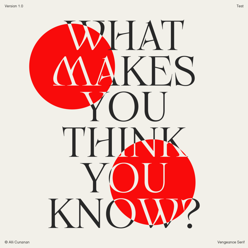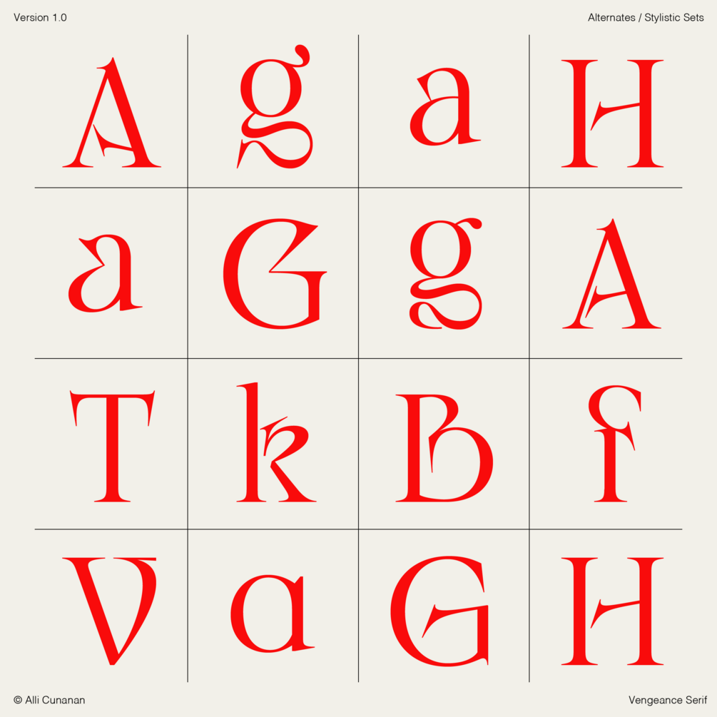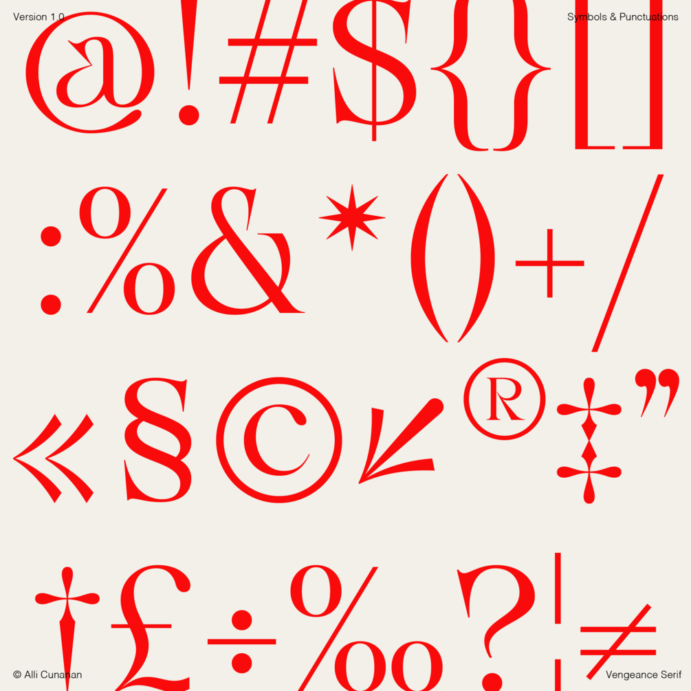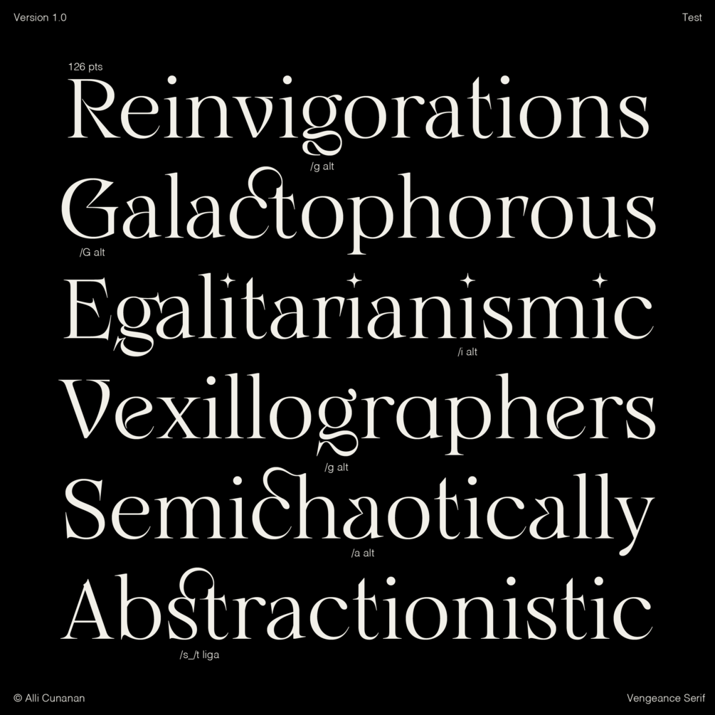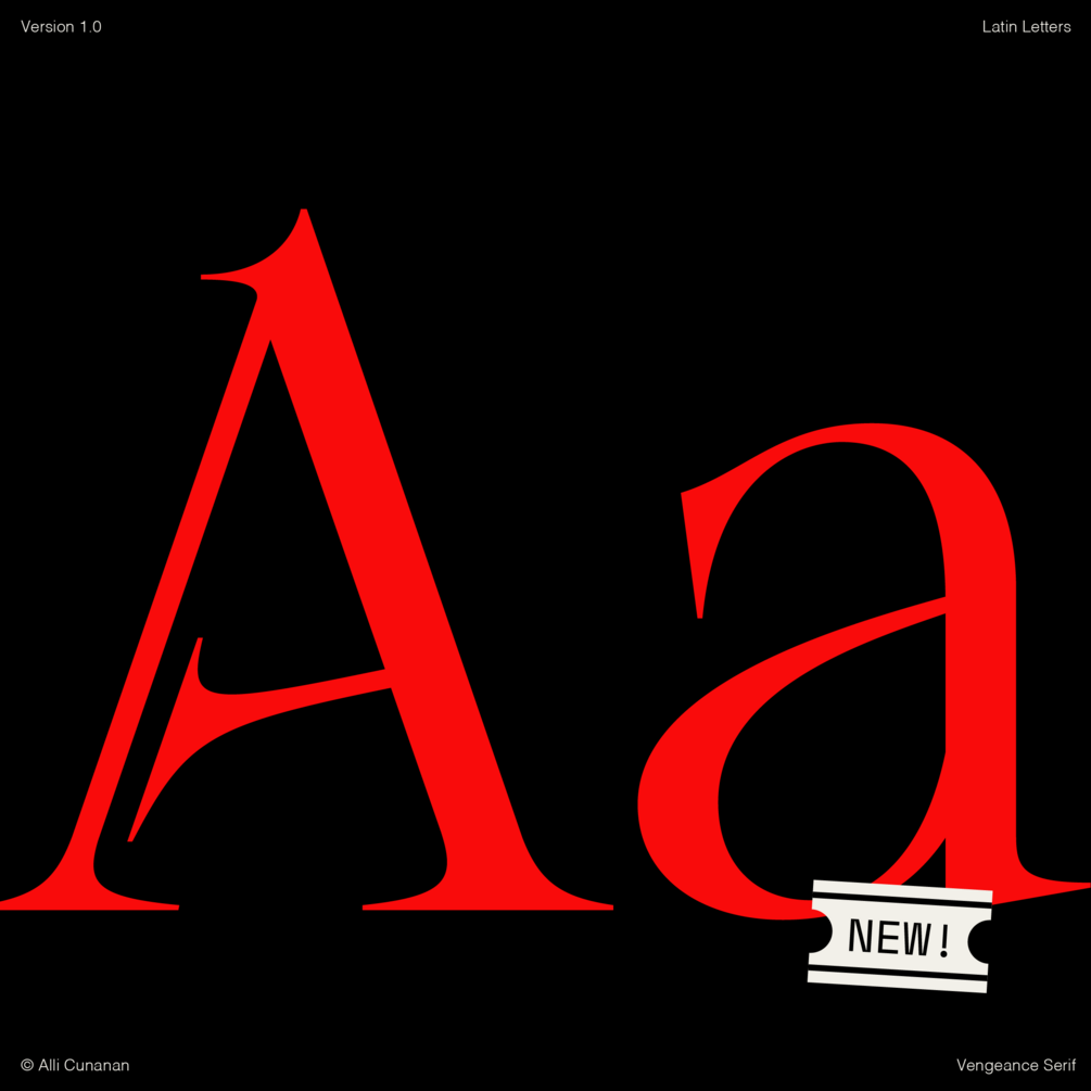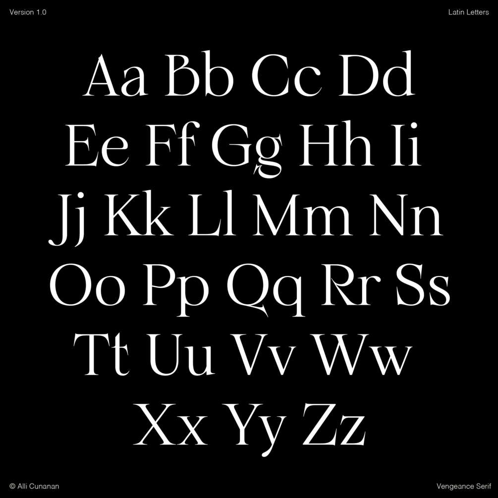 Designed in 2021-2023, Vengeance Serif is a serif display typeface that highlights its distinct sharp edges along with its sleek features, giving it an assertive yet elegant personality.